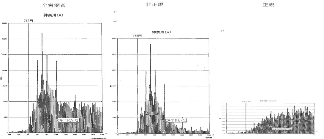 本誌では繰り返しになるが、上図上段は2006年の、下段は今年の、神奈川県に関する中央最低賃金審議会の賃金分布資料である。2006年はすでに述べたように、パートタイマーが増えたことが明確にされていた時期だが、それでも最近に比べると、低賃金労働者の分布中心は最低賃金から少しは離れている。