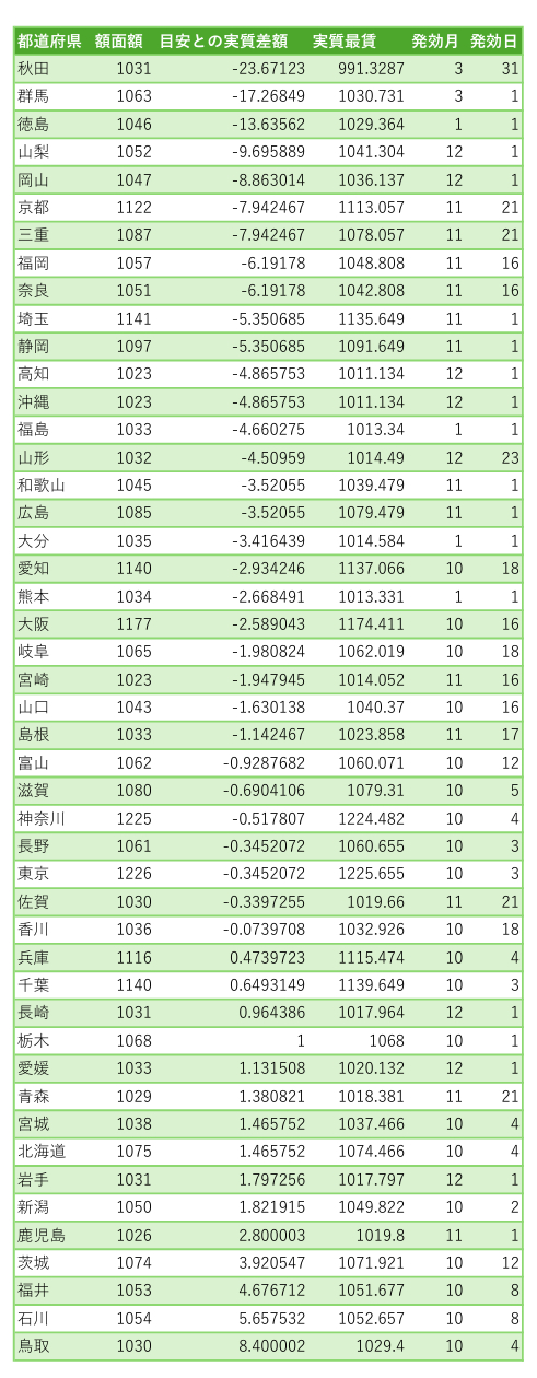 昨年の発効日は、大幅に金額を引き上げた徳島県が11月1日だったの以外はすべての都道府県が10月中で、それも月前半に集中していた。ところが今年は、秋田県が来年3月31日、群馬県が3月1日、福島、徳島、大分、熊本4県が来年1月1日、山形が12月23日、その他12月1日が7県、11月が13県で、10月は20都道府県(1日は栃木のみ、それ以外の上旬は11都道県)に留まった。様変わりである。