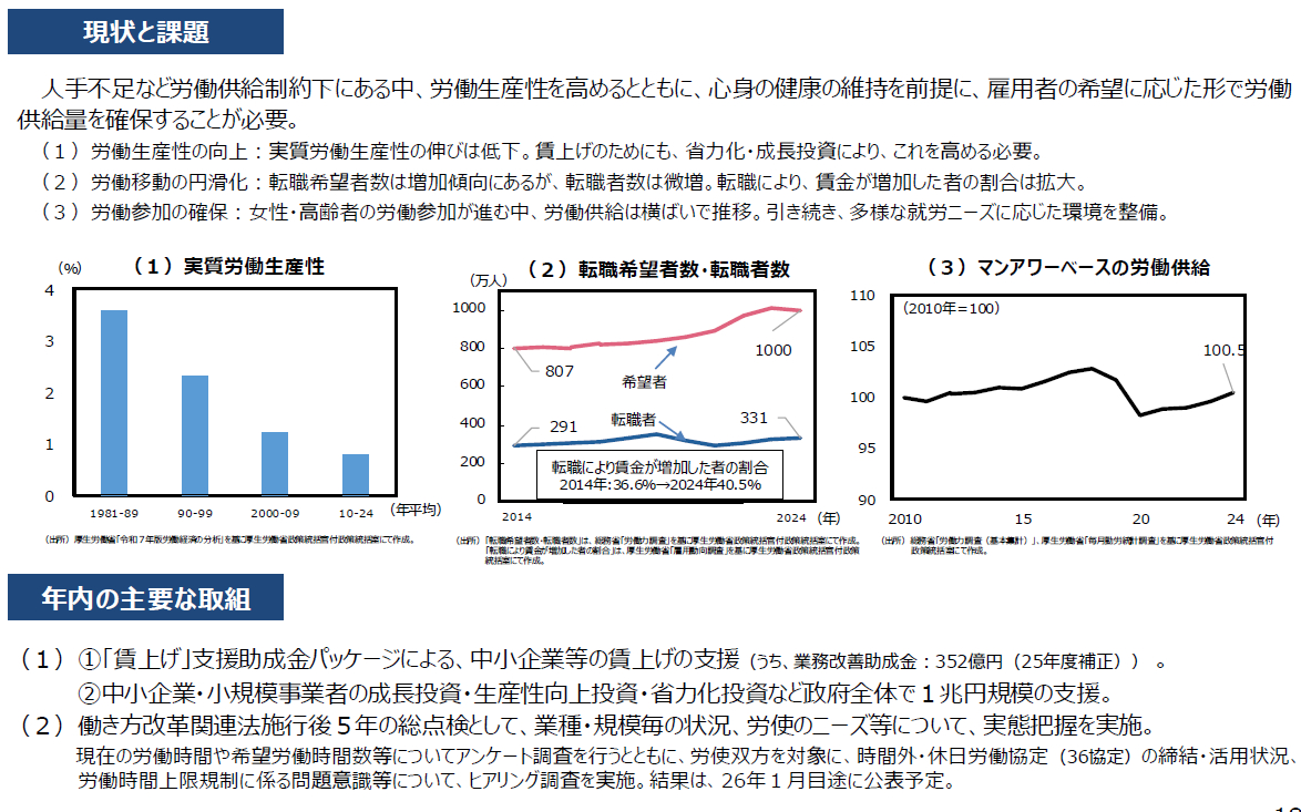 また、「現状と課題」についても、喫緊の課題であるはずの賃金引上げの具体的政策にはほとんど触れず、関心は労働移動(首切り?)に集中しているようである。